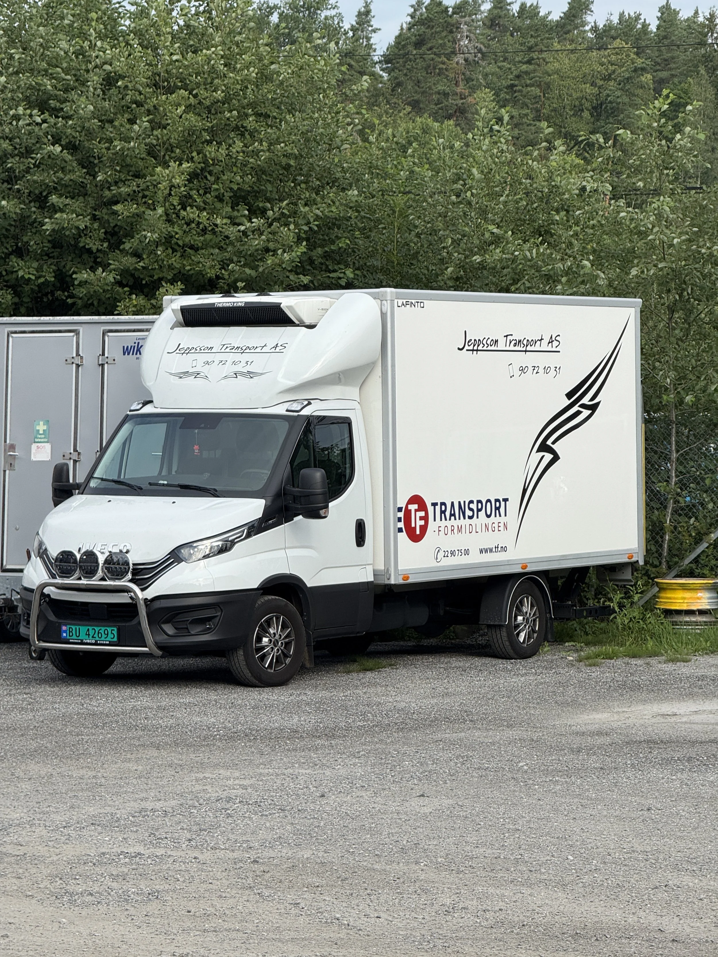 En hvit varebil med logo og kontaktinformasjon for Jeppsson Transport AS, parkert på en grusvei foran en hekk og trær.