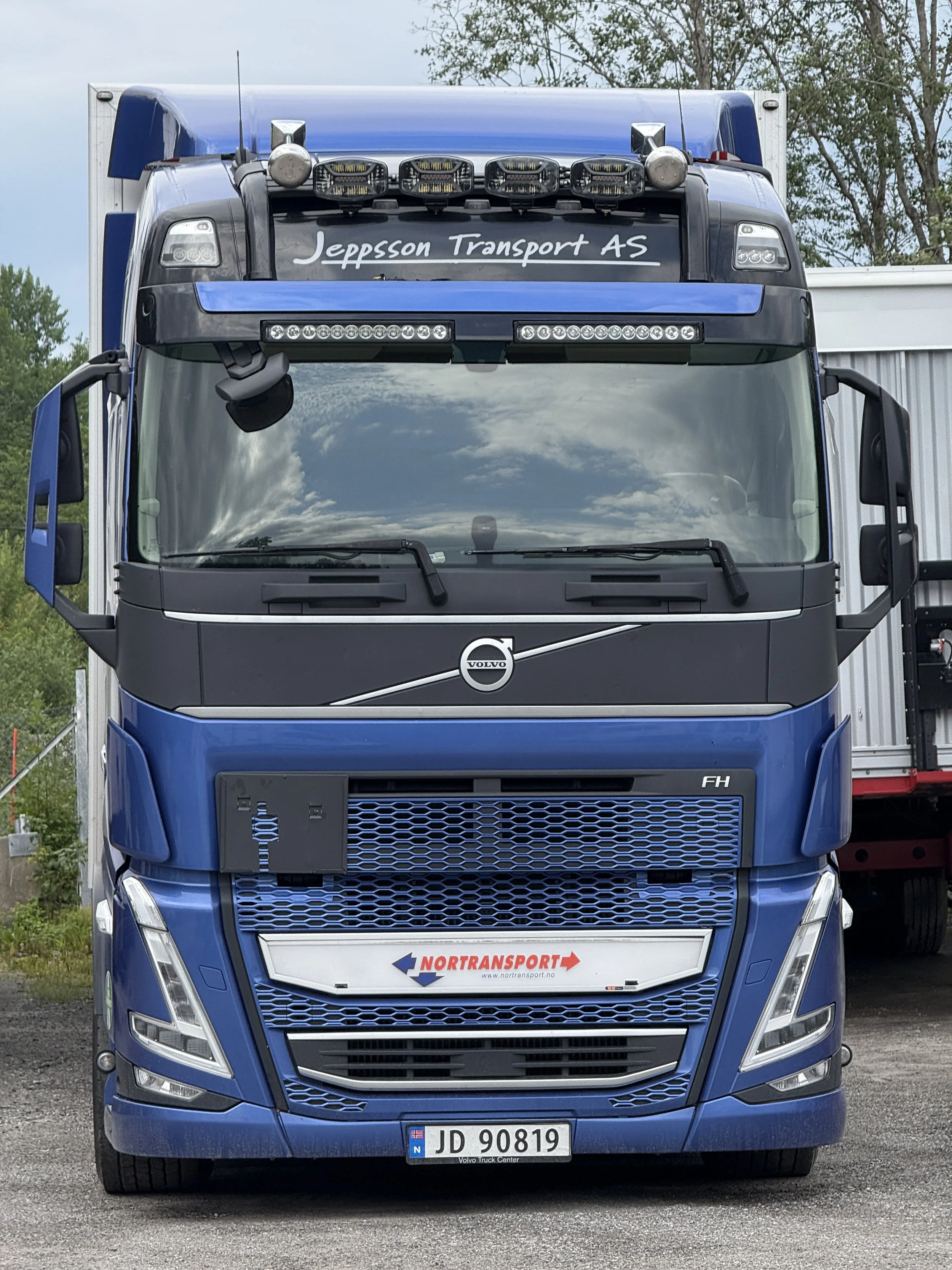 En blå lastebil med teksten 'Jeppsson Transport AS' på frontruten, merket 'NORTRANSPORT' på frontgrillen, og registreringsnummer JD 90819.